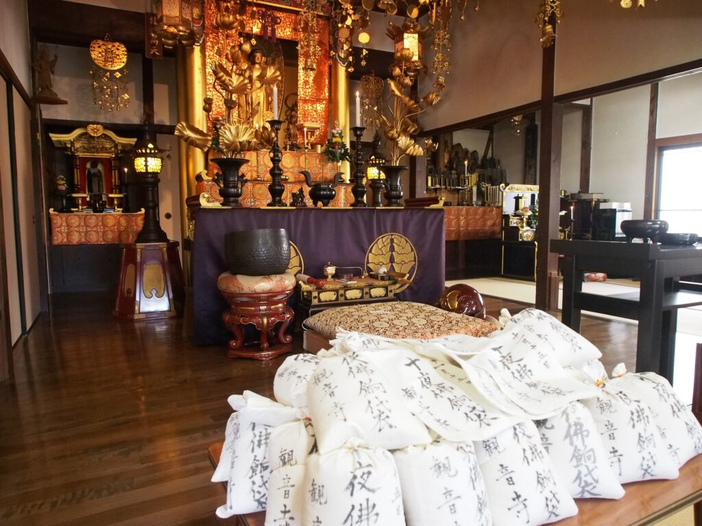 十夜法要は阿弥陀さまに感謝の気持ちを伝える法要でもあることから、秋の収穫に感謝する意味で、仏前に新米や、新米で作ったおはぎ、小豆飯(赤飯)などが供えられてます。当寺院では、新米をお供えし、お参りの皆さまにお赤飯を召し上がっていただいています。
