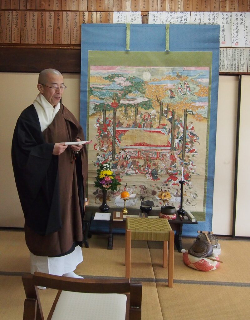 涅槃会では、その様相を描いた絵図「涅槃図」やお釈迦さまのお像を祀ります。当寺院では、1800年(寛政12年)に描かれた涅槃図を毎年祀っています。